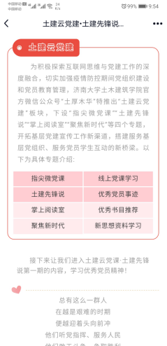 其中,“指尖微党课”组织线上党课学习,为广大师生提供党课学习资料,普及党的相关知识。“土建先锋说”宣传优秀党团员的先进事迹,为广大党团员树立榜样标杆,传递正能量。“掌上阅读室”向党团员推荐优秀必读书籍,培养良好的阅读习惯。“聚焦新时代”推出时政热点分析及党和国家的重要精神和思想学习资料,打造互联网思政教育工作平台。第一期“土建先锋说”推出了优秀退伍学生厉宁的事迹和个人感悟,第一期“指尖微党课”推出了p站