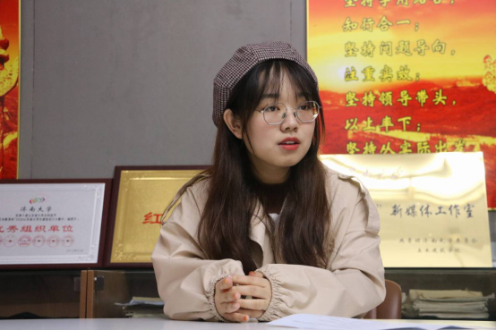 这是2019年的立冬,刚入夜天气就变得寒冷。千鸟格的橘色昵帽,浅浅的风衣颜色,散着头发的张佳荦同学刚进入屋便给我们带来了温暖亲切的感觉。2019年11月10日下午七点,本次采访在八教222房间顺利进行着。