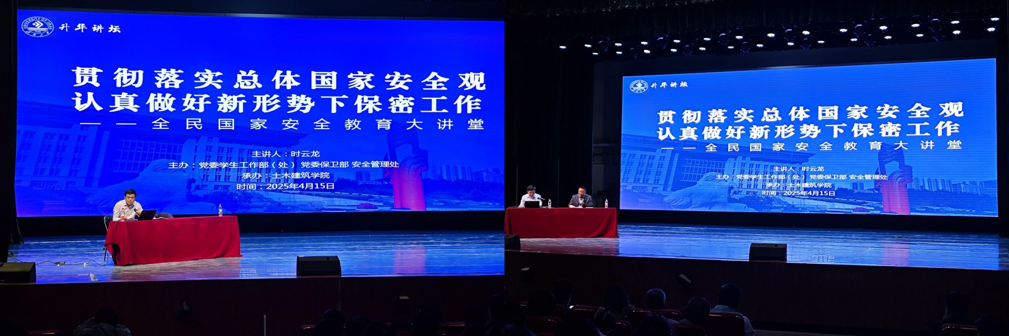承办的升华讲坛-全民国家安全教育大讲堂在学校大礼堂举行。济南市市委机要保密局技术中心业务二室副主任时云龙受邀作专题授课。党委保卫部 安全管理处 部(处)长李荣光主持活动,各单位涉密人员、各p站