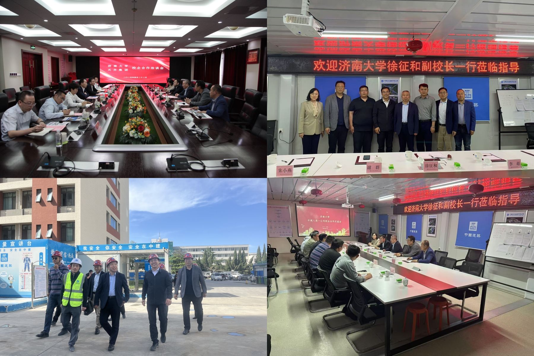 最后,徐征和一行走访慰问了中建八局一公司在淄博各项目部的校友。山东理工大学副校长崔焕勇及后勤处相关领导、中建八局一公司山东理工大学项目经理赵云雷、项目总工李霄熠、淄博口腔医院项目总工校友李奔、博山氢能产业园项目经理校友郑立栋出席会议。崔焕勇代表淄博校友对徐征和一行的到来表示热烈欢迎和感谢,并带领参观了中建八局一公司的示范项目山东理工大学宿舍楼。座谈会上徐征和向崔焕勇等各位淄博校友表达了诚挚的慰问,希望今后加强两校之间以及校企之间的密切交流与合作。校友代表郑立栋、李奔向母校老师汇报了本人成长经历和取得的成绩,表达了对母校的感恩之情。