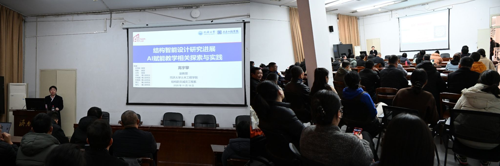 作为学校“智赋教学”讲坛系列活动的重要组成部分,本次报告旨在推动AI技术与土木建筑专业教学、科研深度融合,助力学院土木类专业群转型升级。主讲人高宇擎副教授毕业于美国加州大学伯克利分校,现任同济大学博士生导师,长期专注于基于人工智能的结构健康监测、结构智能设计及结构智能防灾研究,在AI与土木建筑交叉学科领域成果丰硕,具备扎实的学术功底与丰富的实践经验。