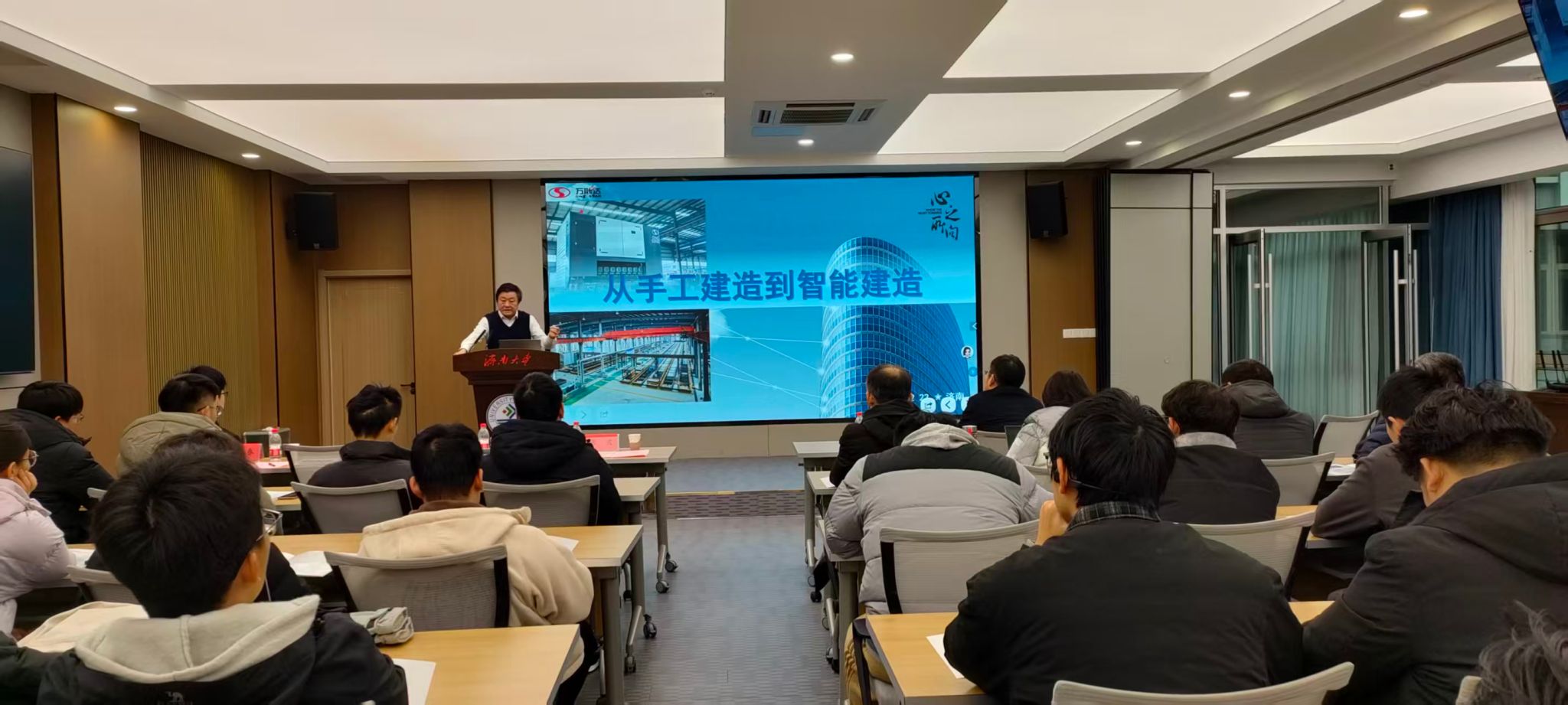 开幕式后,张波作题为《从手工制造到智能建造》的特邀学术报告。他结合万斯达在装配式建筑、智能建造等领域的实践研发成果,从政策、设计、施工、运维等多维度系统阐释了“装配式+智能化”的建造模式,并与现场师生就智能建造技术、人才需求等热点展开深入交流,气氛热烈。