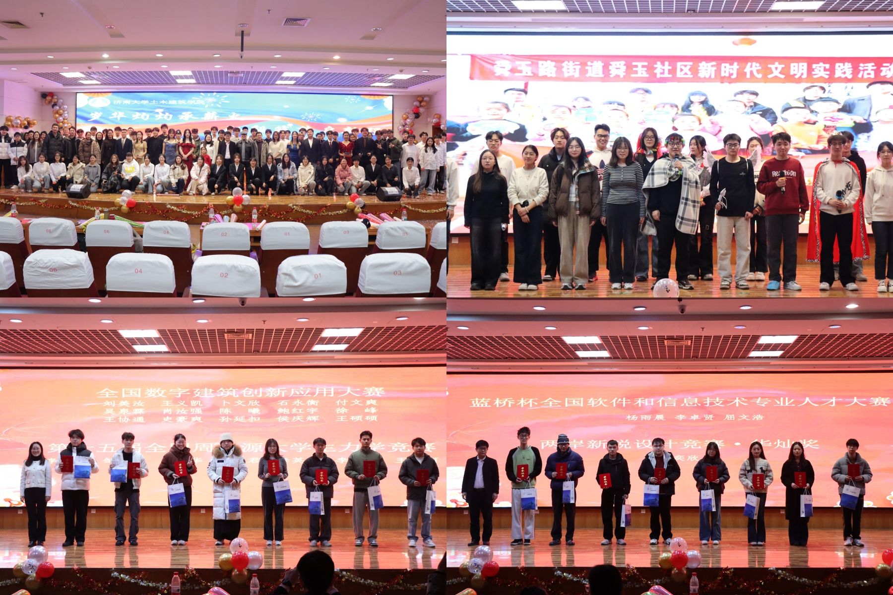为表彰先进典范、树立榜样标杆,进一步凝聚奋进力量、弘扬优良学风,晚会期间,学院举行 2025 年度学生表彰仪式。学办主任李婷宣读了为建院群星与文体活动团队颁奖的决定,团委书记孙晓爽宣读了为科创团队代表颁奖的决定。与会领导及教师代表为获奖学子依次颁奖。