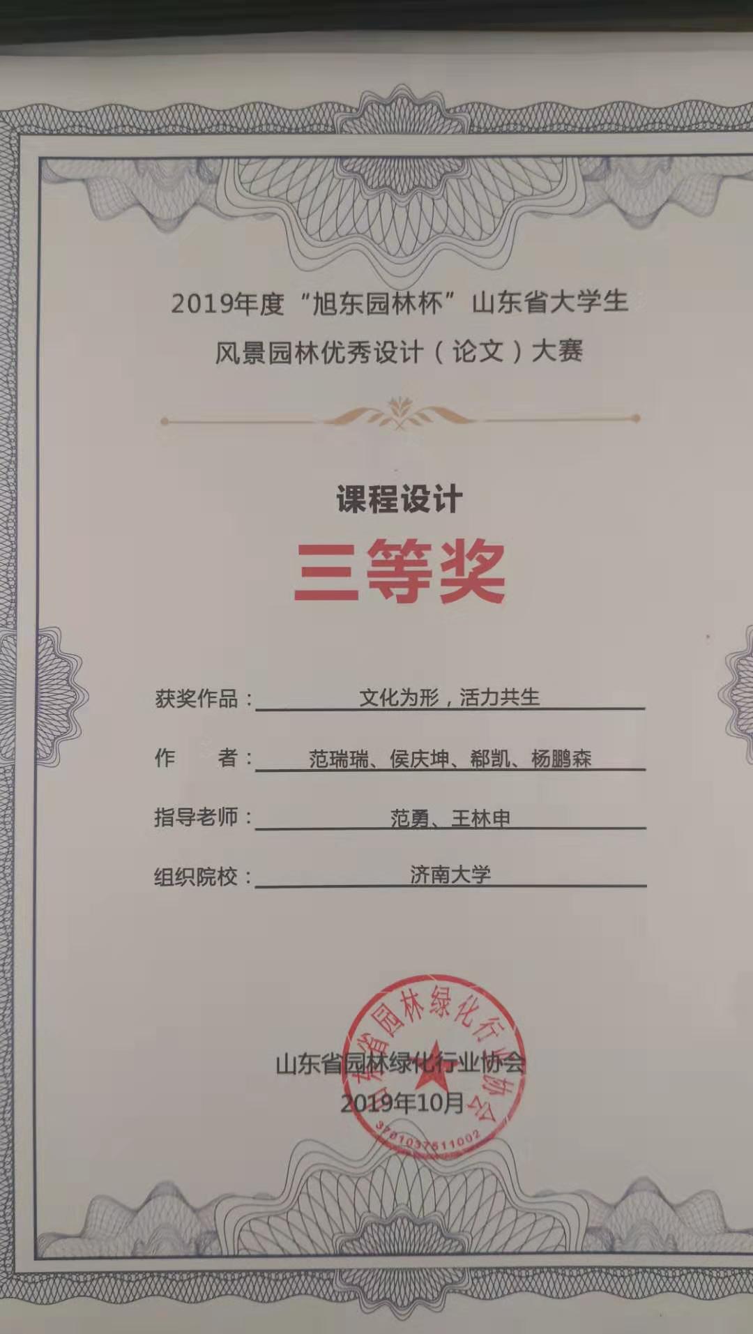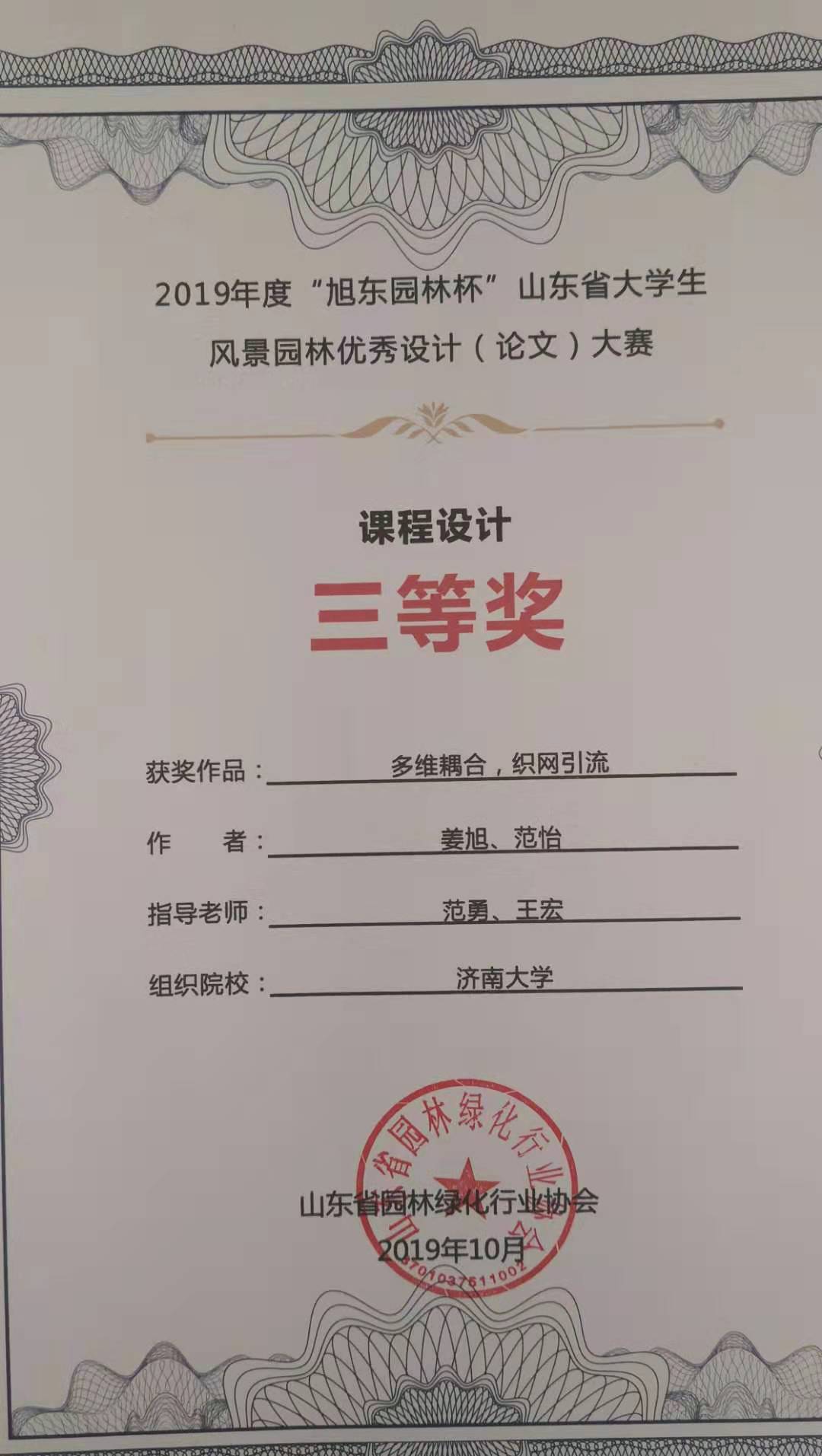 11月9日,2019年“旭东园林杯”山东省大学生风景园林优秀设计(论文)大赛评选揭晓,我院学生作品在此次大赛中获得三等奖2项,p站