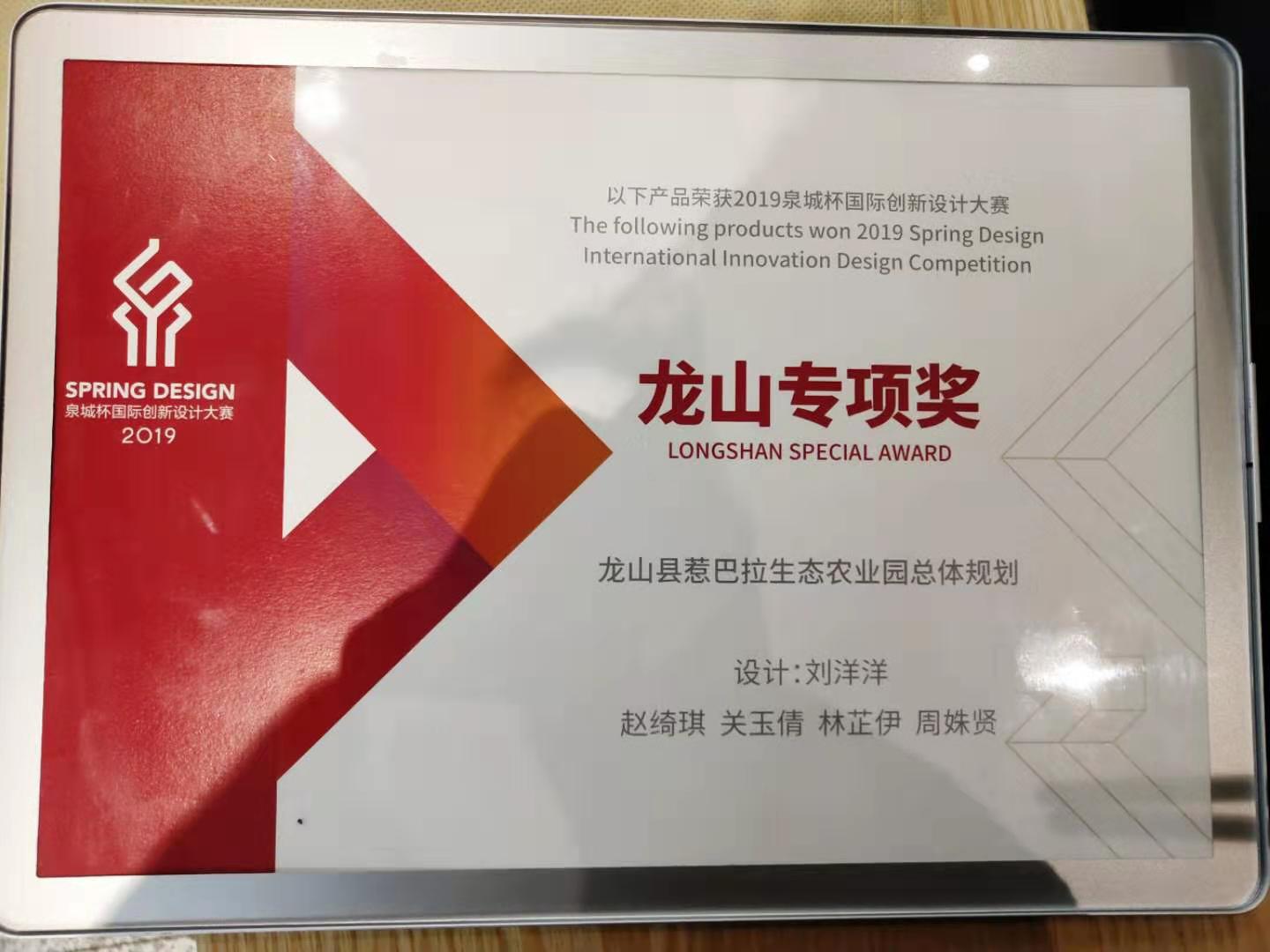 11月22日上午,由济南市人民政府、中国工业设计协会信息与交互设计专业委员会主办的首届“泉城杯”国际创新设计大赛颁奖典礼、设计创新与区域发展高峰论坛在济南举行。大赛设有产品组、概念组和公益与公共服务组、“设计龙山”专项赛等组别,共收到来自11个国家和地区的146家设计企业,52所高校的1356个设计团队,1879名设计师的5129件设计作品。由p站城乡规划系教师范勇指导,城乡规划和建筑学专业学生刘洋洋、赵绮琪、关玉倩、林芷伊、周姝贤等共同完成的参赛作品《龙山县惹巴拉生态农业园总体规划》获得大赛“龙山专项奖”。
