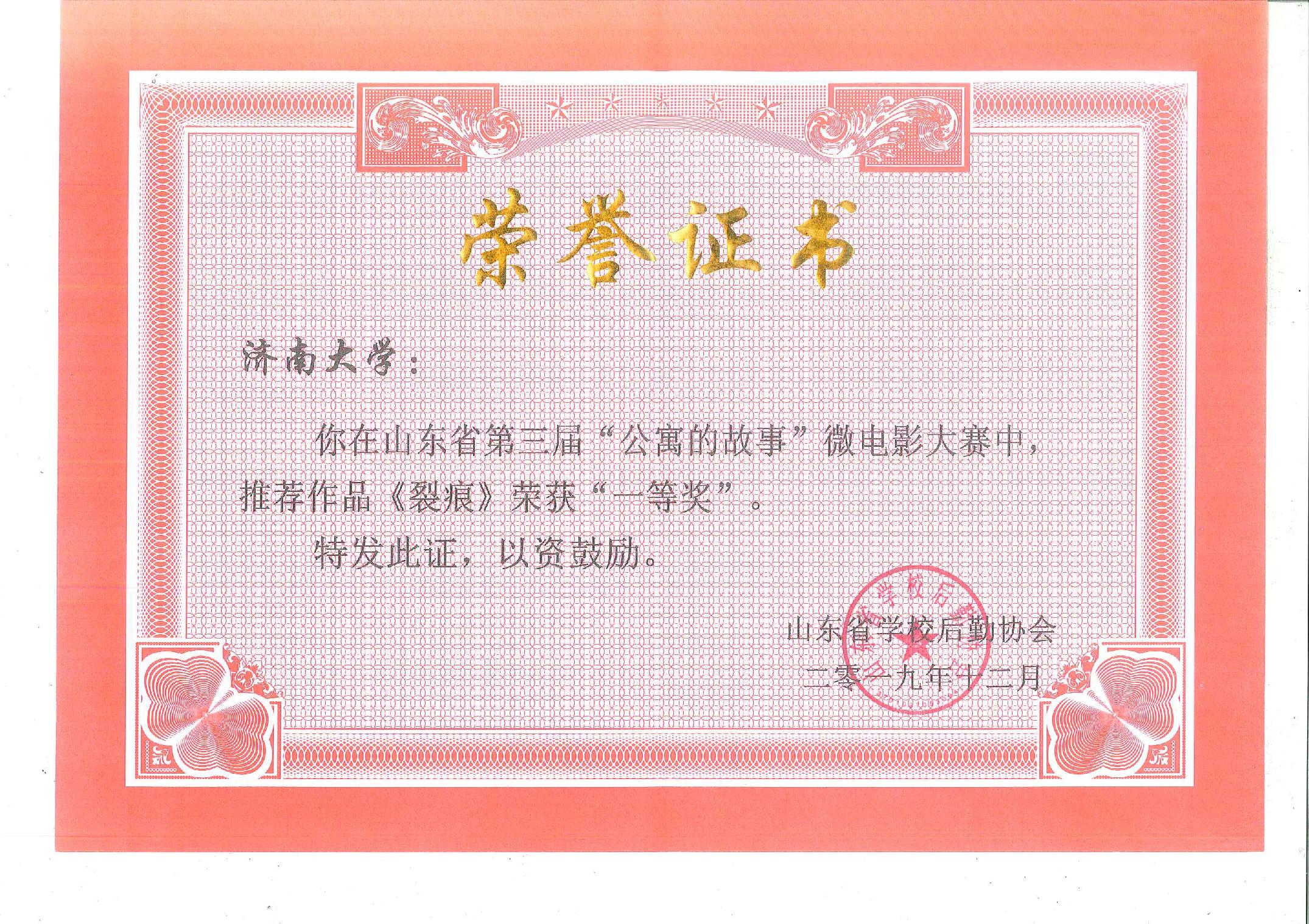 十佳舍长”称号。此外,p站微电影作品《裂痕》荣获2019年山东省“公寓的故事”微电影大赛一等奖,p站老师白雪飞荣获优秀指导教师称号,该片创作人员张星宇、夏炜宁、栾凯三位同学也分别荣获最佳导演奖、最佳编剧奖和最佳演员奖。