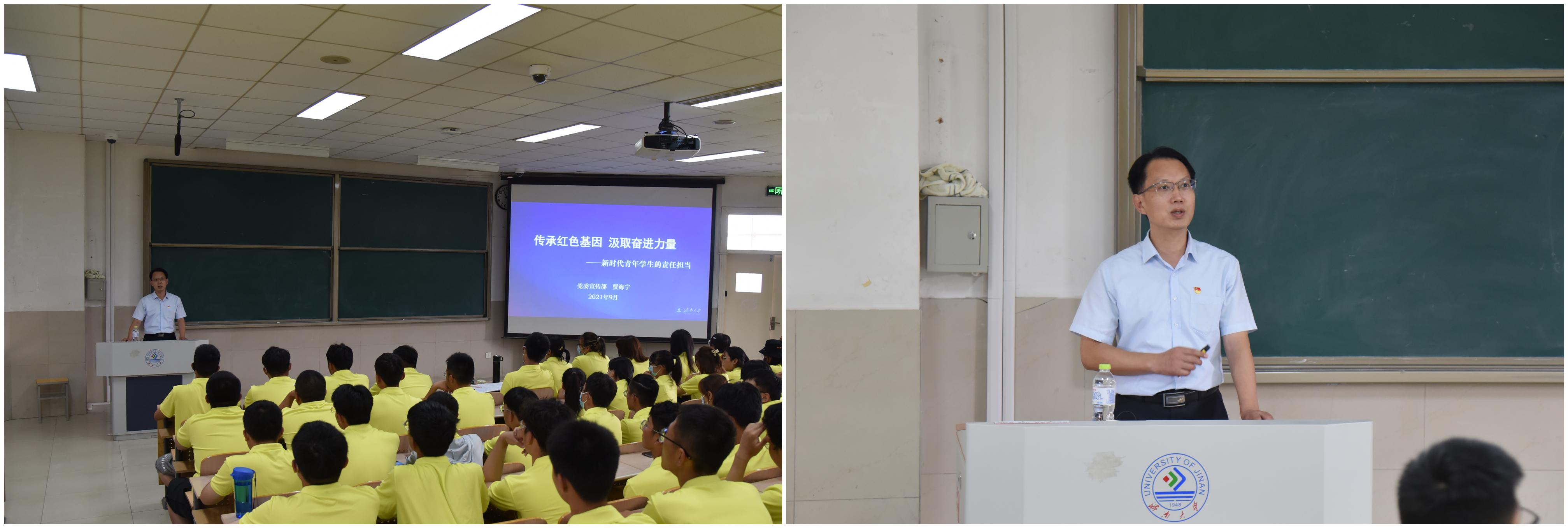 贾海宁首先代表学校欢迎2021级新生的到来,他以“传承红色基因,汲取奋进力量——新时代青年学生的责任担当”为题,从四个方面展开讲座:一是汲取力量,做堪当民族复兴重任的时代新人。贾海宁鼓励同学们学党史、学校史,要从中国共产党建党以来的百年征程中感悟初心使命,从p站