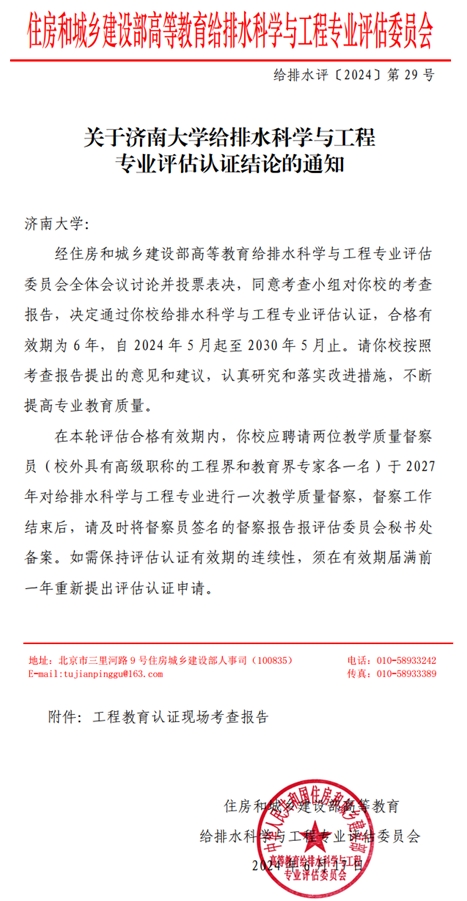给排水科学与工程专业自1998年建立以来,秉承“以评促建”的发展理念,专业建设工作取得了长足的进步,2006年获市政工程硕士学位授予权,2008年建成山东省给排水科学与工程品牌专业,2010年获土木工程一级学科和建筑与土木工程领域工程硕士学位授予权。2012年通过全国高校给排水科学与工程专业评估,2018年通过工程教育专业评估(认证),2021年获批国家一流专业。本次通过专业评估(认证)复评,是专业评估委员会对我校上一阶段专业建设工作的认可,我们也将按照考察报告的意见和建议,及时分析问题、查找不足,积极落实改进措施,不断提高专业教育质量。