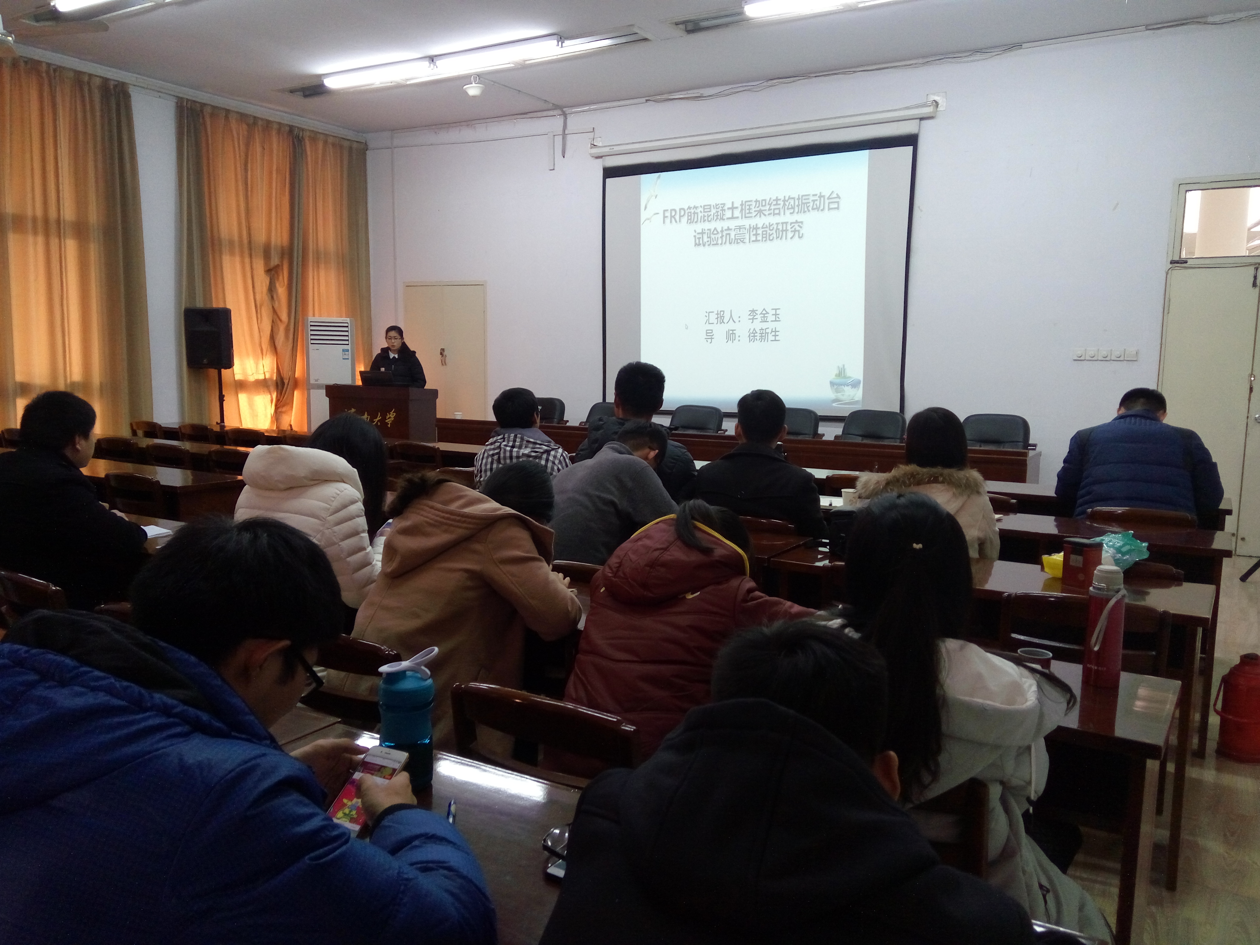 秦老师的报告结束后,土木工程专业的研究生们进行了论文交流,如“基于协同作用的预应力锚杆复合土钉支护预应力阈值模型试验研究”的岩土工程方向报告,“新型粘弹性抗侧力体系抗震性能分析”以及“FRP筋混凝土框架结构振动台试验抗震性能研究”的结构工程方向的报告,并就秦主任和研究生们的报告做了热烈讨论,极大的展示了同学们的学习热情。