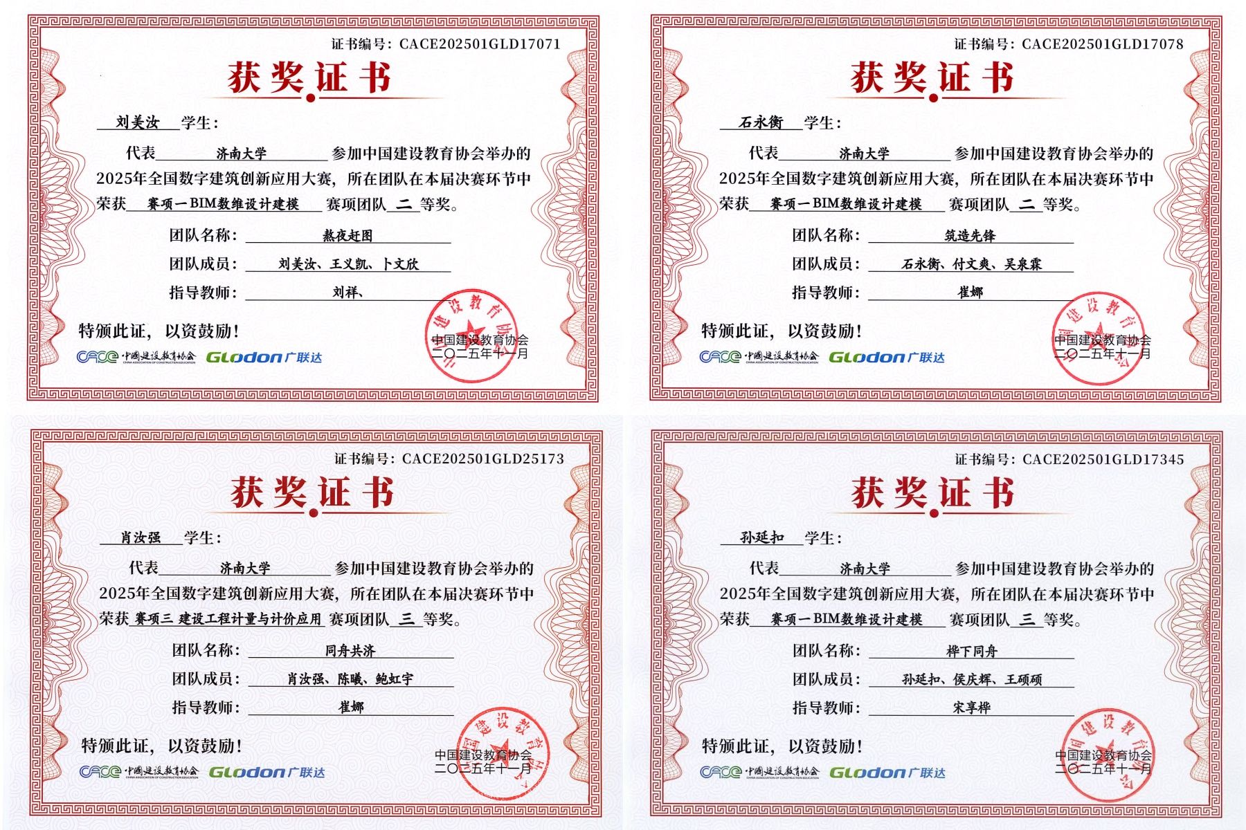 在“BIM数维设计建模”和“建筑工程计量与计价应用”两个赛项中荣获2项国家级二等奖,3项国家级三等奖。