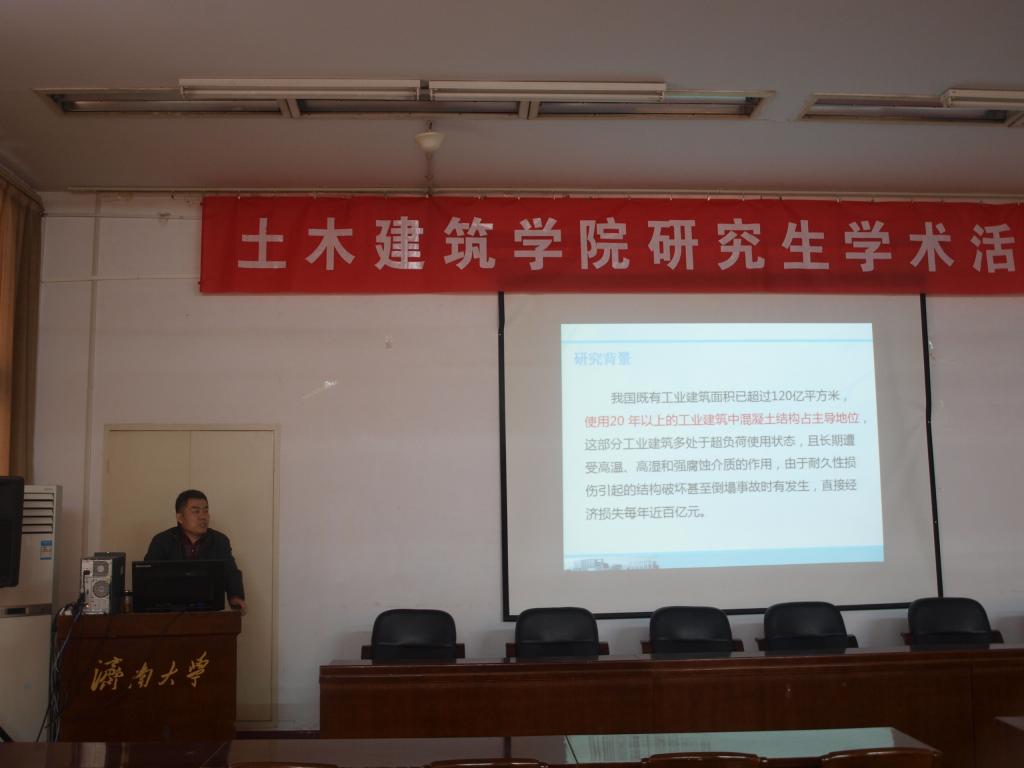 林明强博士就“工业建筑混凝土结构耐久性研究进展”做了主题学术报告。随后有12名研究生对其学术论文做了相应报告。