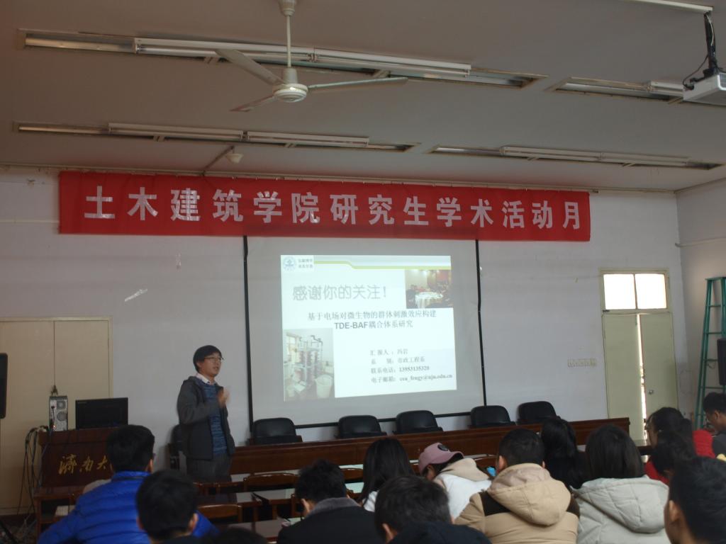 冯岩博士就“基于电场对微生物的群体刺激效应构建TDE-BAF耦合体系研究”做了主题学术报告。随后有12名研究生对其学术论文做了相应报告。