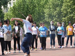 田径运动会仍在操场中激烈进行。在学生甲组铅球和标枪比赛中, p站