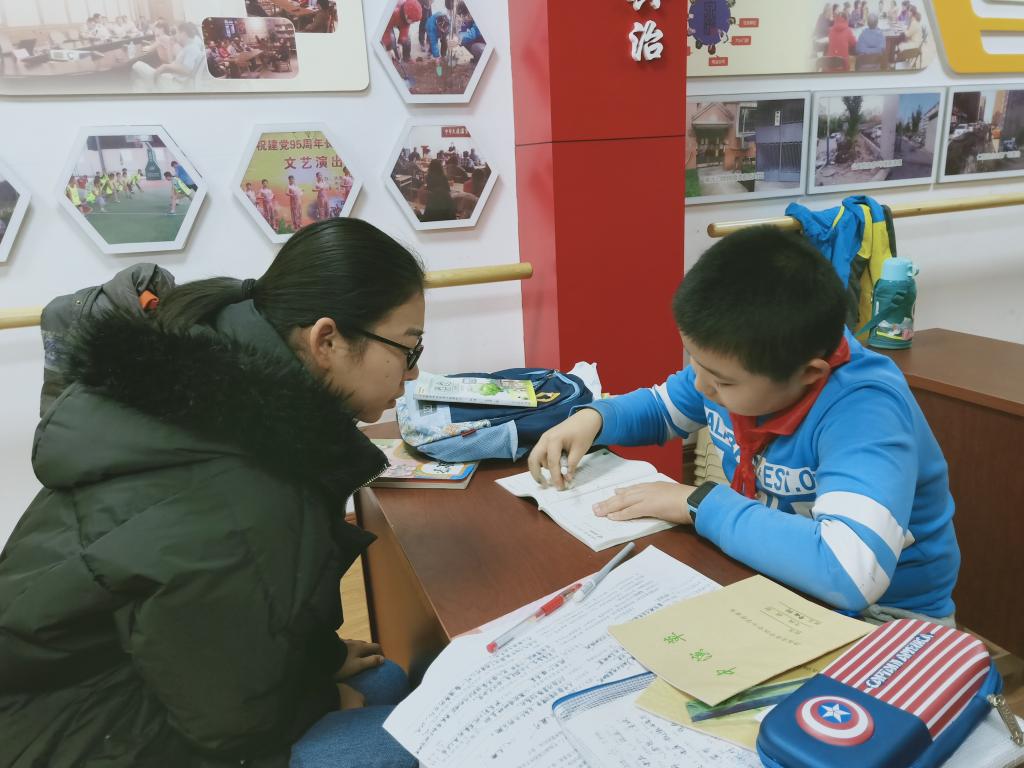 志愿者们来到梁南社区,辅导小学生们关于毛笔字书法的知识。