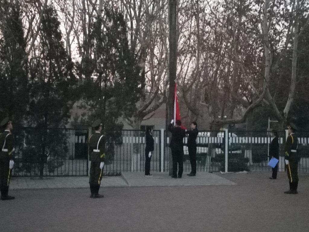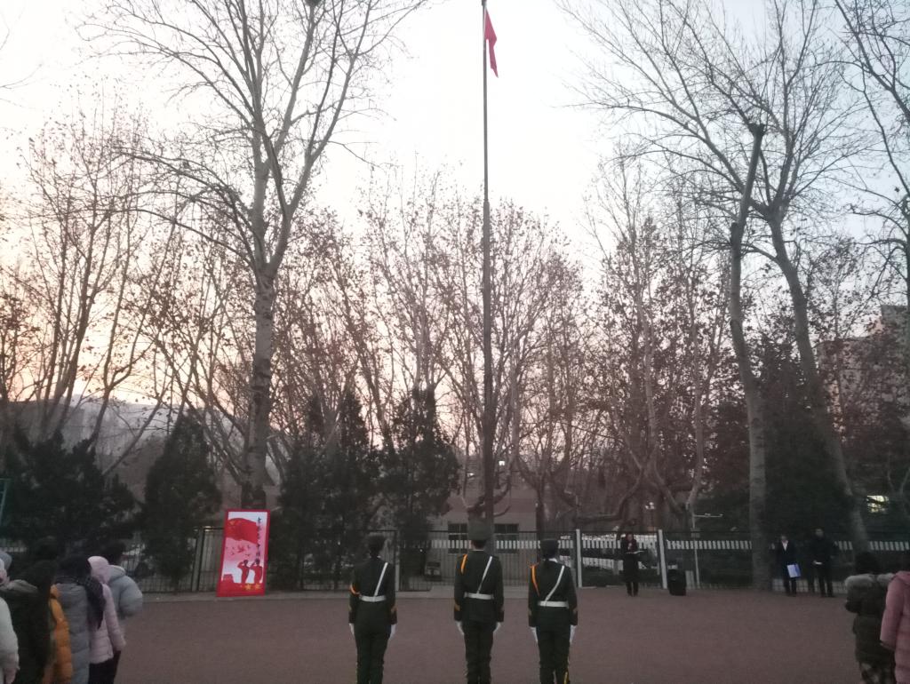 选拔出三位政治立场坚定,具有较高的政治素养和良好道德品质且成绩突出,在学生中具有较高威信和榜样作用的学生担任升旗手。升旗仪式开始,同学们精神抖擞,秩序井然。升国旗奏国歌,雄壮的义勇军进行曲响起,全体师生庄严肃穆对国旗行注目礼,注视国旗冉冉升起。鲜艳的五星红旗在p站