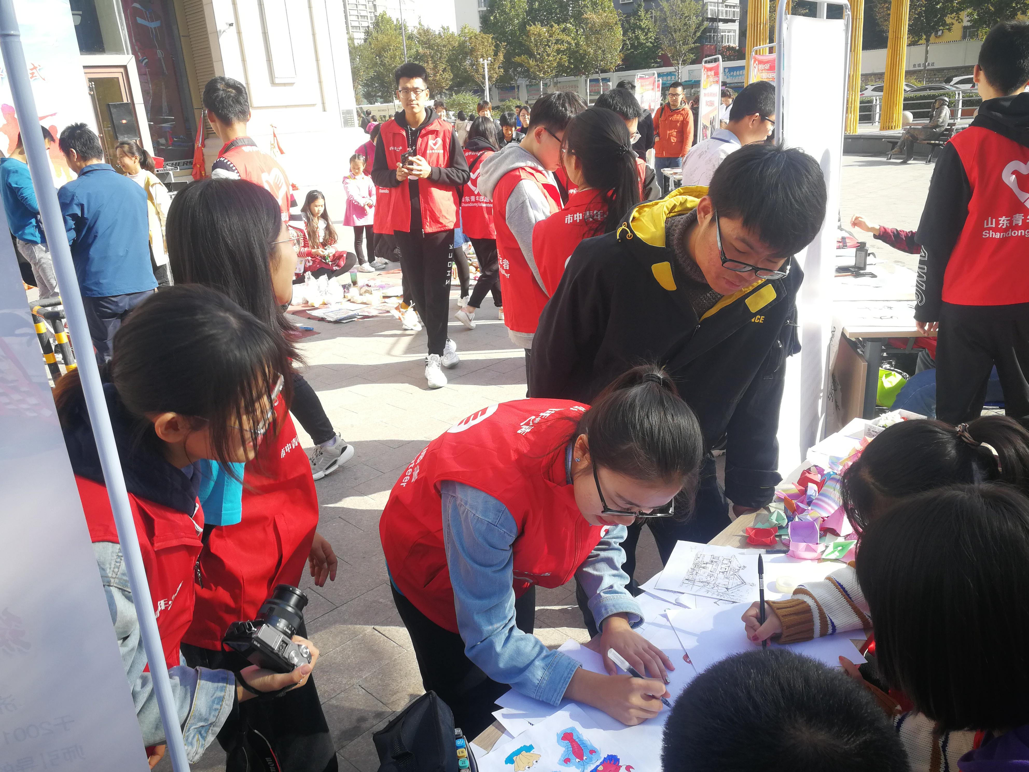 伴随着清晨的阳光,志愿者们早早来到志愿展示摊位将活动所需的帐篷、展板等物品放置就位,将准备的建筑照片贴出用于给参与者展示建筑美术之美,并安排志愿者们随时进行讲解。活动中,志愿者们手把手教小朋友们简笔画,让小朋友自己尝试绘画,并选出优秀的简笔画进行展示,还赠送每一位小朋友一个小礼物,作为奖励。在折纸环节,志愿者通过分步教学们教给小朋友们折一些简单的小物件,方法简单易懂,很多小朋友们当场学会。在折纸过程中,志愿者引导小朋友们发挥自己的想象,运用学到的简笔画知识对折纸作品进行装饰组合,装饰完成后,还进行了一次小小的比赛,挑出了三个最佳个作品,志愿者们把精心准备的纪念品奖励给他们。