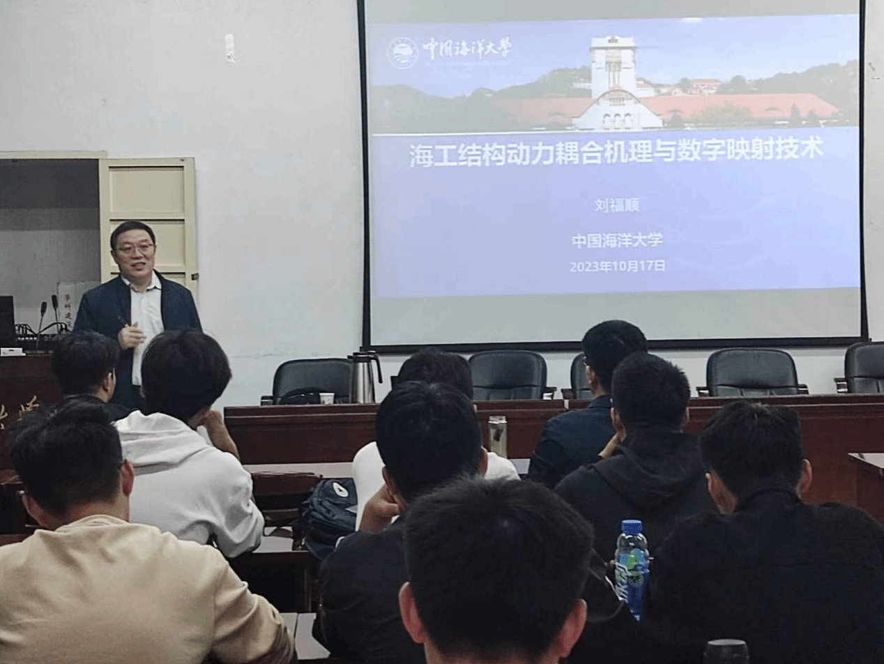 报告会上,刘福顺教授首先向大家介绍了自己的研究团队及研究方向和领域,随后刘教授就海工结构动力耦合机理与数字映射技术的工程应用场景和研究进展展开了详细的讲解。刘教授提出了海上风电结构瞬态动力响应分析新方法,实现了海上风电结构多因素耦合作用下瞬态响应的高精度计算,解决了地震动与海洋环境荷载同步输入的技术难题,为高烈度区海上风电场建设提供一种更为科学的分析技术与试验平台。最后刘教授向大家展示了未来研究方向的蓝图——依据海上实测数据建立海上风电数字孪生模型,并且耐心与参会师生进行了深入地探讨和交流,加深了同学们对相关专业学科前沿的认知。