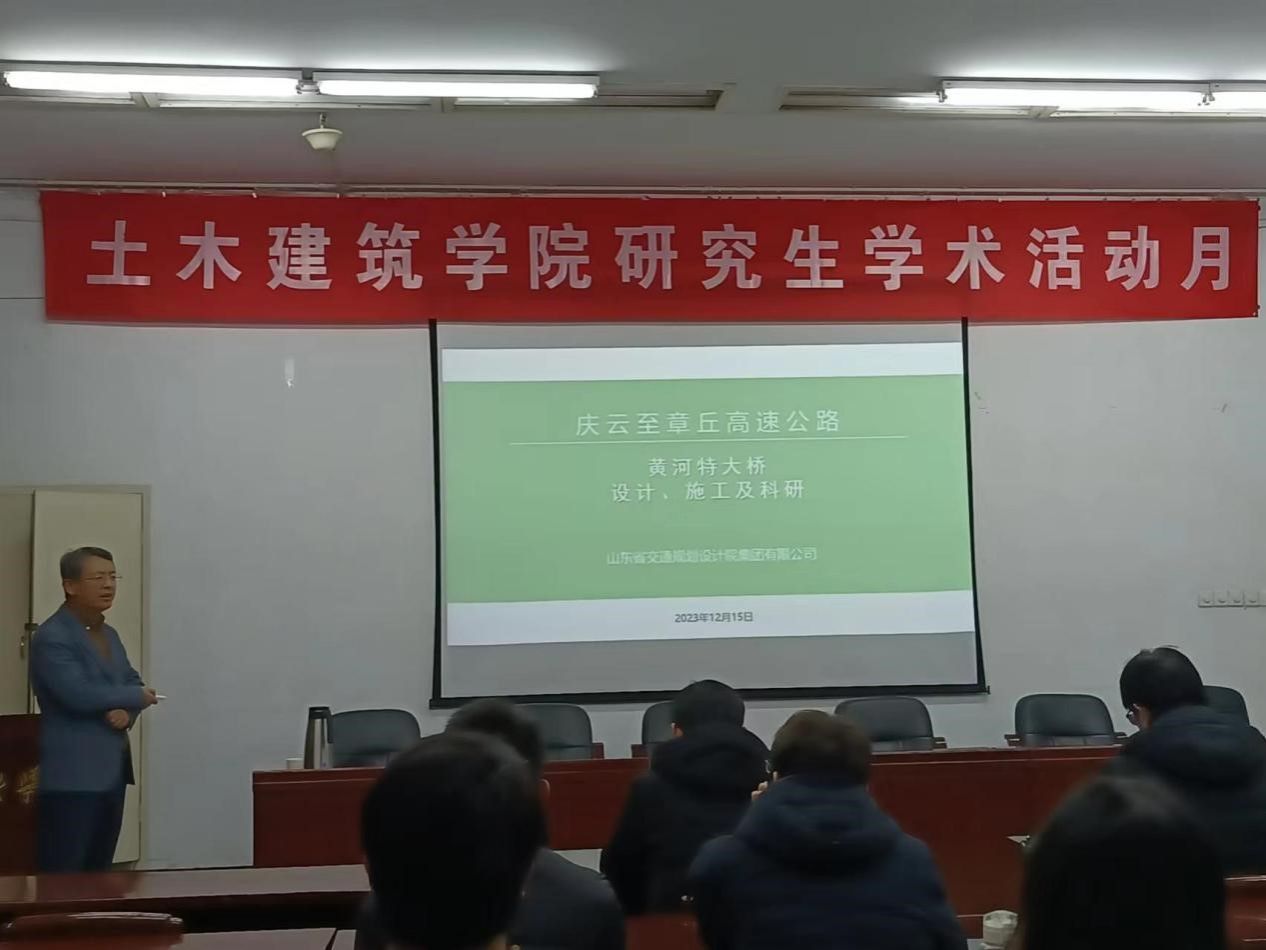 2023年12月15号,p站 特邀山东省交通设计规划设计院集团有限公司副总经理徐召作题为《庆云至章丘高速公路黄河特大桥设计、施工及科研》的学术报告。报告由p站 院长谢群教授主持,p站 相关专业师生参加了报告会。