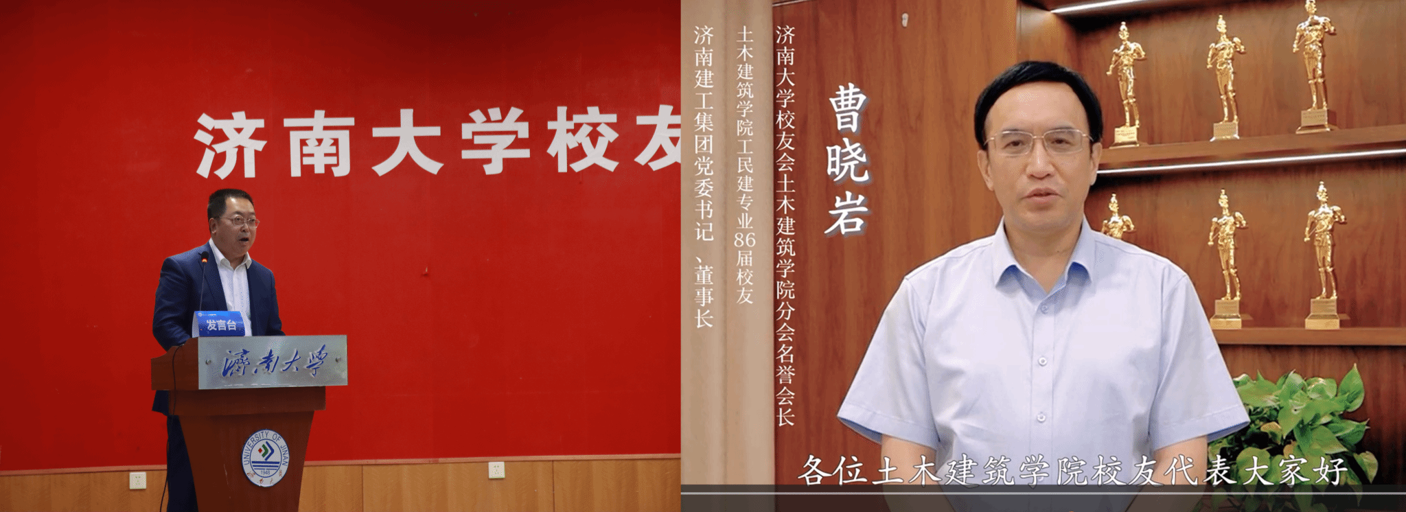 校友会名誉会长、济南建工集团党委书记、董事长、86届校友曹晓岩通过视频讲话方式祝贺校友会成立,表示定将与校友共同努力,为母校和p站 的发展增光添彩;与校友并肩携手,共同发展,以校友发展促进母校发展。