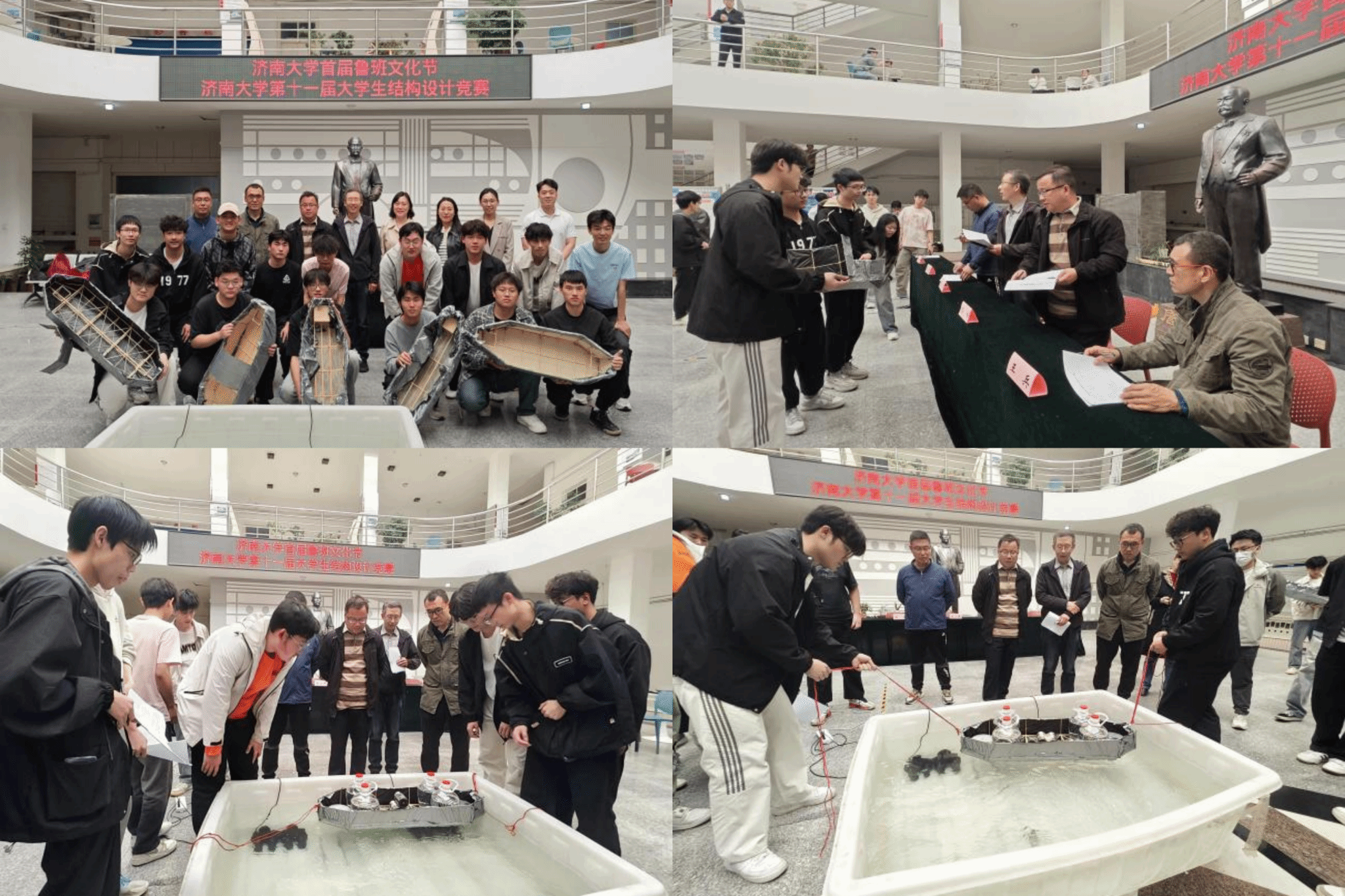本次竞赛的主题为乌篷船模型结构设计与制作。参赛团队在第一环节进行乌篷船模型尺寸测量、变形检查等规避区检验及称重测量。随后,队员从船体设计制作、主要参数、结构受力分析、节点构造与施工等方面进行现场陈述并完成问辩环节。在模型加载测试阶段,各团队通过放置不同质量砝码、开启造浪装置、绳套牵引等方式考察船体的流线型、平衡度、撞击能力、承载能力与航行能力。每当一项荷载测试顺利通过后,热烈的掌声层层迭起。评委老师对各项参赛作品进行了详细点评,针对作品结构设计的不足提出相应改进意见。