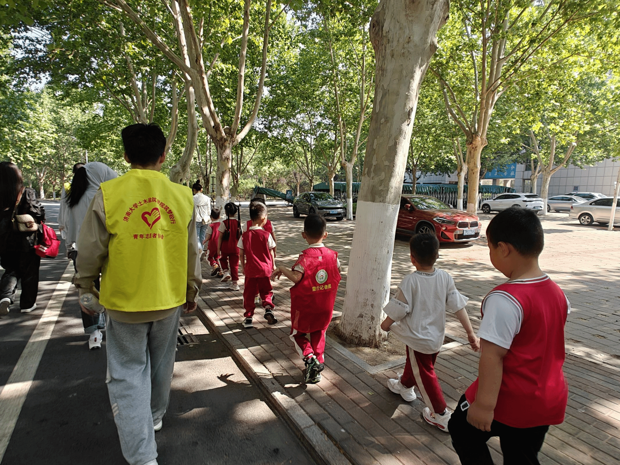 4名专业讲解员与10位热情志愿者。在他们引导下,萌娃们整齐列队,有序步入校园。